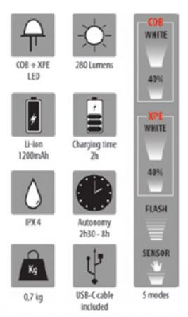 - Modes d'éclairage : 5 (LED COB : 100% / 40%, LED XPE : 100% / 40%, Flash).